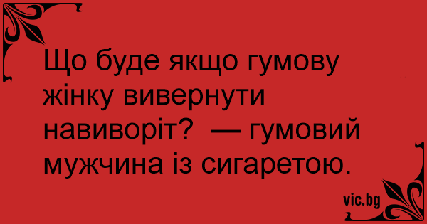 Що буде якщо гумову жінку вивернути навиворіт? — гумовий мужчина із сигаретою.