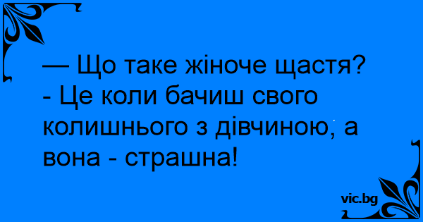 — Що таке жіноче щастя? - Це коли бачиш свого колишнього з дівчиною, а вона - страшна!