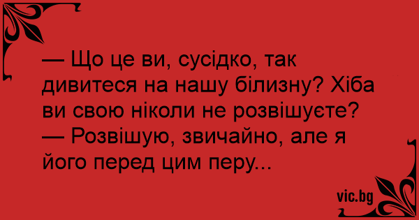 — Що це ви, сусідко, так дивитеся на нашу білизну? Хіба ви свою ніколи не розвішуєте?