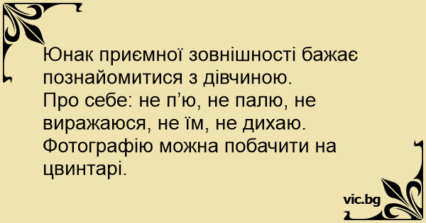 Про себе: не п’ю, не палю, не виражаюся, не їм, не дихаю. Фотографію можна побачити на цвинтарі.