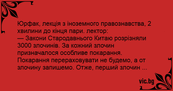 Юрфак, лекція з іноземного правознавства, 2 хвилини до кінця пари. лектор: — Закони Стародавнього Китаю розрізняли 3000 злочинів. За кожний злочин призначалося особливе покарання. Покарання перераховувати не будемо, а от злочину запишемо. Отже, перший злочин ...