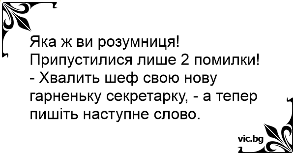 Яка ж ви розумниця! Припустилися лише 2 помилки! - Хвалить шеф свою нову гарненьку секретарку, - а тепер пишіть наступне слово.