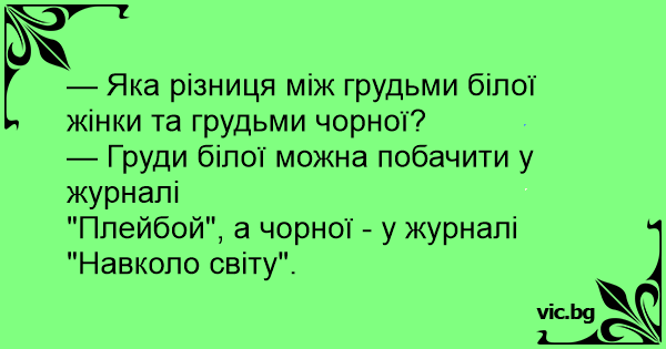 — Яка різниця між грудьми білої жінки та грудьми чорної?
