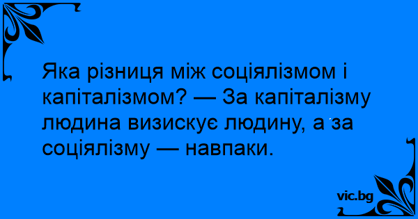 Яка різниця між соціялізмом і капіталізмом? — За капіталізму людина визискує людину, а за соціялізму — навпаки.