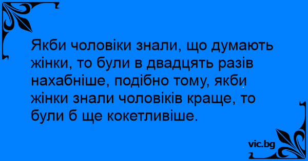 Якби чоловіки знали, що думають жінки, то були в двадцять разів нахабніше, подібно тому, якби жінки знали чоловіків краще, то були б ще кокетливіше.