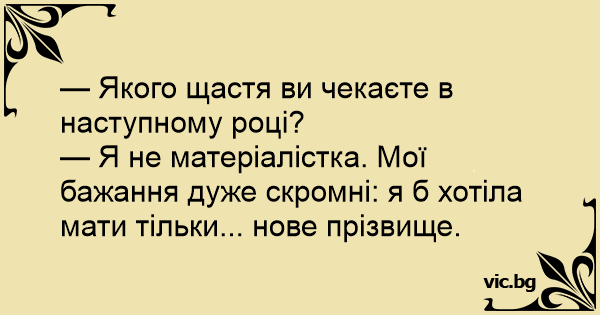 — Я не матеріалістка. Мої бажання дуже скромні: я б хотіла мати тільки... нове прізвище.