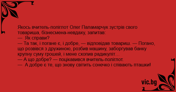 Якось вчитель-поліглот Олег Паламарчук зустрів свого товариша, бізнесмена-невдаху, запитав: