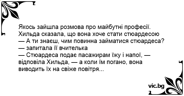 Якось зайшла розмова про майбутні професії. Хильда сказала, що вона хоче стати стюардесою