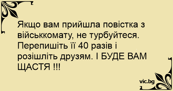 Якщо вам прийшла повістка з військкомату, не турбуйтеся. Перепишіть її 40 разів і розішліть друзям. І БУДЕ ВАМ ЩАСТЯ !!!
