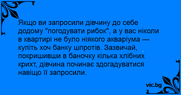 Якщо ви запросили дівчину до себе додому "погодувати рибок", а у вас ніколи в квартирі не було ніякого акваріума — купіть хоч банку шпротів. Зазвичай, покришивши в баночку кілька хлібних крихт, дівчина починає здогадуватися навіщо її запросили.