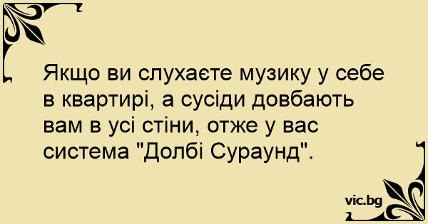Якщо ви слухаєте музику у себе в квартирі, а сусіди довбають вам в усі стіни, отже у вас система "Долбі Сураунд".