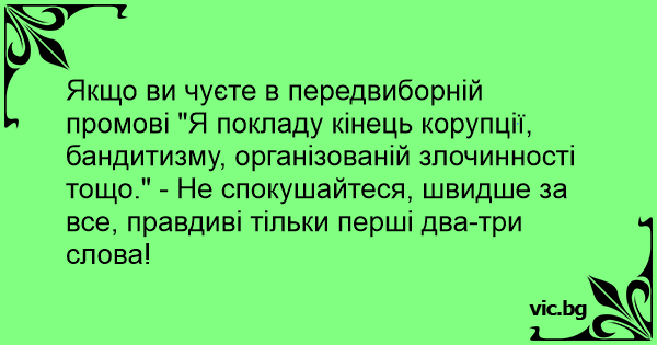 Якщо ви чуєте в передвиборній промові "Я покладу кінець корупції, бандитизму, організованій злочинності тощо." - Не спокушайтеся, швидше за все, правдиві тільки перші два-три слова!