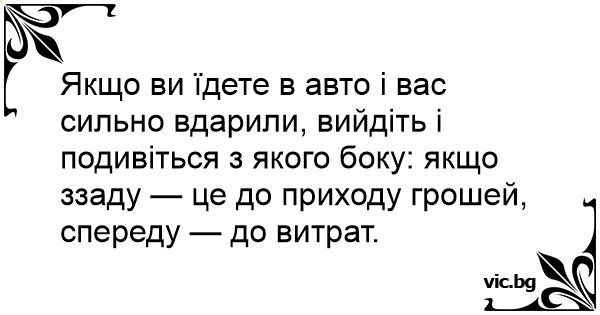 Якщо ви їдете в авто і вас сильно вдарили, вийдіть і подивіться з якого боку: якщо ззаду — це до приходу грошей, спереду — до витрат.