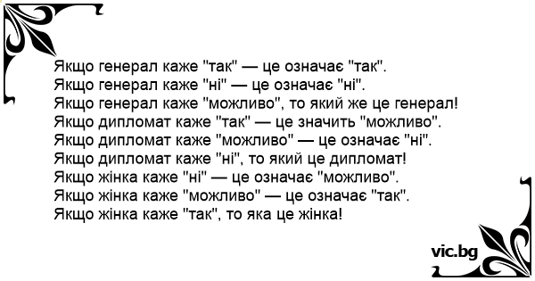 Каква е разликата между дипломат и дама? Когато дипломата казва "да", това означава "може би". Ако каже "може би", това означава "не". Ако каже "не", значи не е дипломат. Когато една дама каже "не", това означава "може би". Ако каже "може би", това означава "не". Ако каже "да", значи не е дама.