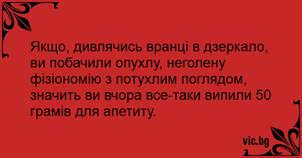 Якщо, дивлячись вранці в дзеркало, ви побачили опухлу, неголену фізіономію з потухлим поглядом, значить ви вчора все-таки випили 50 грамів для апетиту.