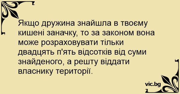 Якщо дружина знайшла в твоєму кишені заначку, то за законом вона може розраховувати тільки двадцять п'ять відсотків від суми знайденого, а решту віддати власнику території.