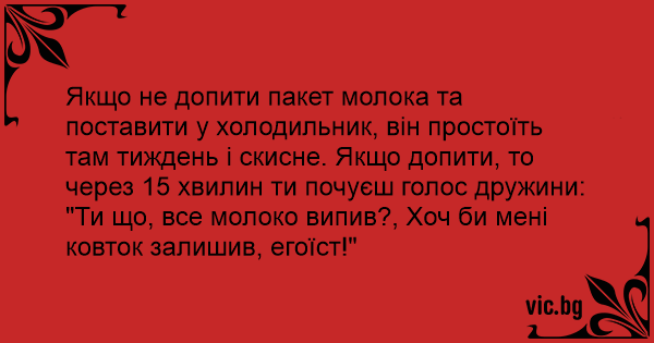 Якщо не допити пакет молока та поставити у холодильник, він простоїть там тиждень і скисне. Якщо допити, то через 15 хвилин ти почуєш голос дружини: