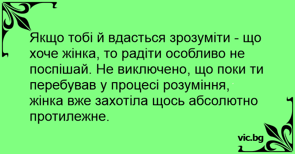 Якщо тобі й вдасться зрозуміти - що хоче жінка, то радіти особливо не поспішай. Не виключено, що поки ти перебував у процесі розуміння, жінка вже захотіла щось абсолютно протилежне.