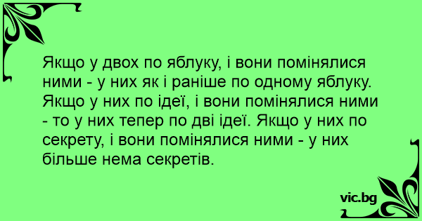 Якщо у двох по яблуку, і вони помінялися ними - у них як і раніше по одному яблуку. Якщо у них по ідеї, і вони помінялися ними - то у них тепер по дві ідеї. Якщо у них по секрету, і вони помінялися ними - у них більше нема секретів.