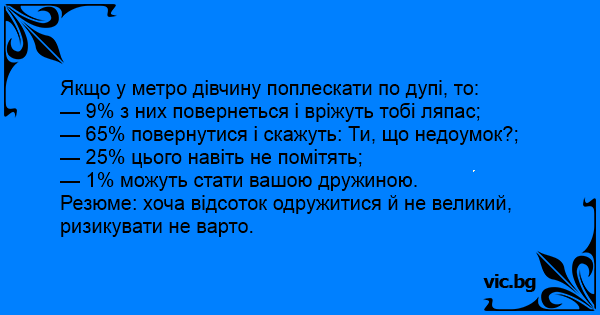 Ако пляснете момиче по дупето в метрото, тогава: - 9% от тях ще се обърнат и ще ви зашлевят; - 65% ще се обрънат и ще ви попитат дали сте глупак - 25% дори няма да го забележат; - 1% могат да се...