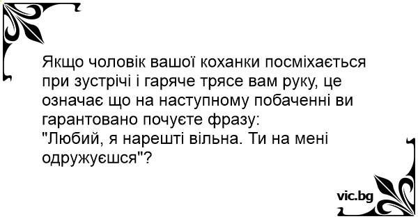 Якщо чоловік вашої коханки посміхається при зустрічі і гаряче трясе вам руку, це означає що на наступному побаченні ви гарантовано почуєте фразу: