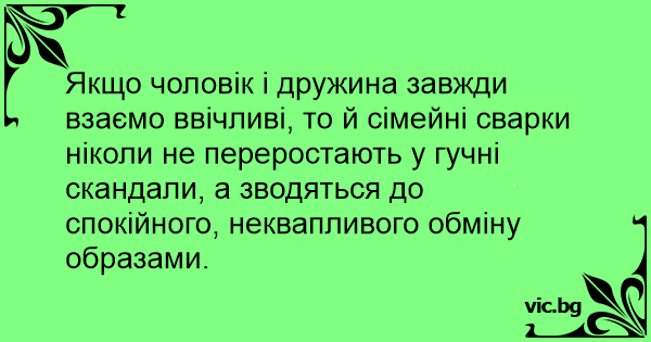 Якщо чоловік і дружина завжди взаємо ввічливі, то й сімейні сварки ніколи не переростають у гучні скандали, а зводяться до спокійного, неквапливого обміну образами.