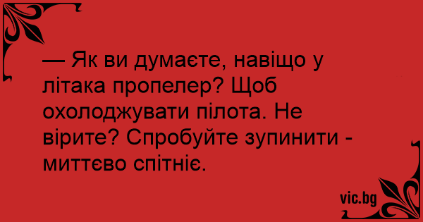 — Як ви думаєте, навіщо у літака пропелер? Щоб охолоджувати пілота. Не вірите? Спробуйте зупинити - миттєво спітніє.