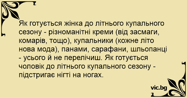 Як готується жінка до літнього купального сезону - різноманітні креми (від засмаги, комарів, тощо), купальники (кожне літо нова мода), панами, сарафани, шльопанці - усього й не перелічиш. Як готується чоловік до літнього купального сезону - підстригає нігті на ногах.