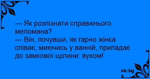 — Він, почувши, як гарно жінка співає, миючись у ванній, припадає до замкової щілини: вухом!