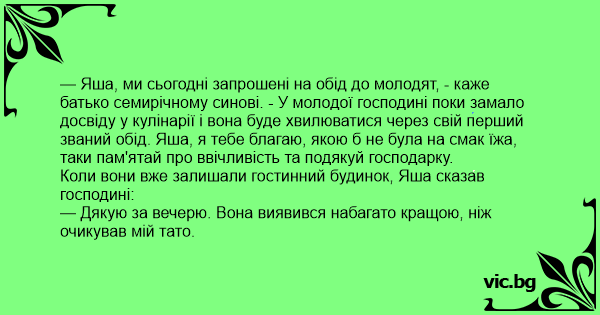 — Яша, ми сьогодні запрошені на обід до молодят, - каже батько семирічному синові. - У молодої господині поки замало досвіду у кулінарії і вона буде хвилюватися через свій перший званий обід. Яша, я тебе благаю, якою б не була на смак їжа, таки пам'ятай про ввічливість та подякуй господарку.