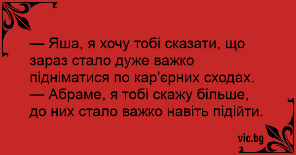 — Яша, я хочу тобі сказати, що зараз стало дуже важко підніматися по кар'єрних сходах.