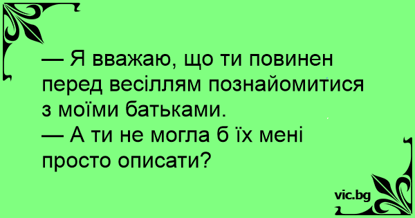 — Я вважаю, що ти повинен перед весіллям познайомитися з моїми батьками.