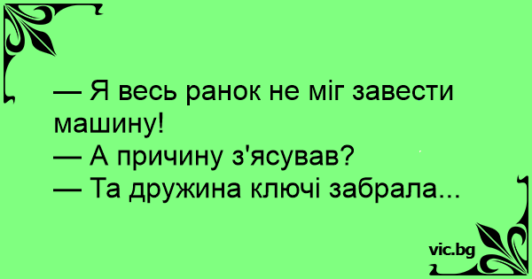 — Я весь ранок не міг завести машину!<br />— А причину з'ясував?<br />— Та дружина ключі забрала...