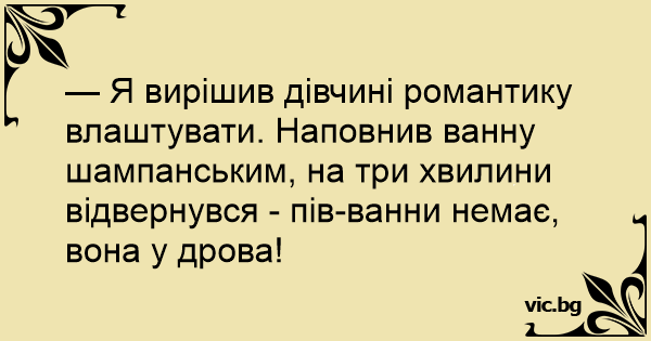 — Я вирішив дівчині романтику влаштувати. Наповнив ванну шампанським, на три хвилини відвернувся - пів-ванни немає, вона у дрова!