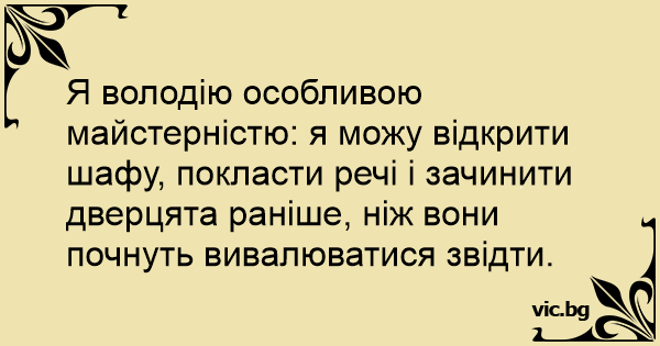 Я володію особливою майстерністю: я можу відкрити шафу, покласти речі і зачинити дверцята раніше, ніж вони почнуть вивалюватися звідти.
