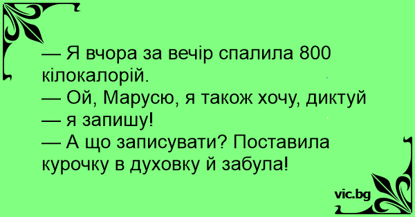 - Вчера без никакъв зор изгорих 800 калории. - Това е добре, казвай подробно. Записвам си. - Просто забравих пицата във фурната.