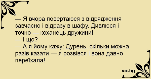 — А я йому кажу: Дурень, скільки можна разів казати — я розвівся і вона давно переїхала!