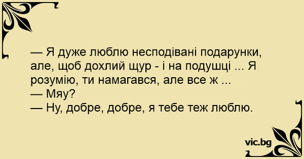 — Я дуже люблю несподівані подарунки, але, щоб дохлий щур - і на подушці ... Я розумію, ти намагався, але все ж ...