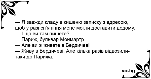 — Я завжди кладу в кишеню записку з адресою, щоб у разі сп'яніння мене могли доставити додому.
