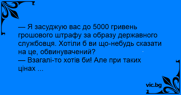 — Я засуджую вас до 5000 гривень грошового штрафу за образу державного службовця. Хотіли б ви що-небудь сказати на це, обвинувачений?