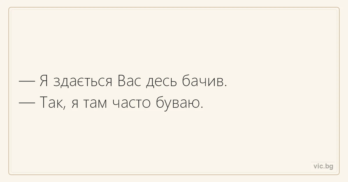 — Я здається Вас десь бачив.<br />— Так, я там часто буваю.