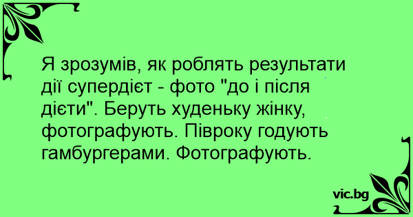 Я зрозумів, як роблять результати дії супердієт - фото "до і після дієти". Беруть худеньку жінку, фотографують. Півроку годують гамбургерами. Фотографують.