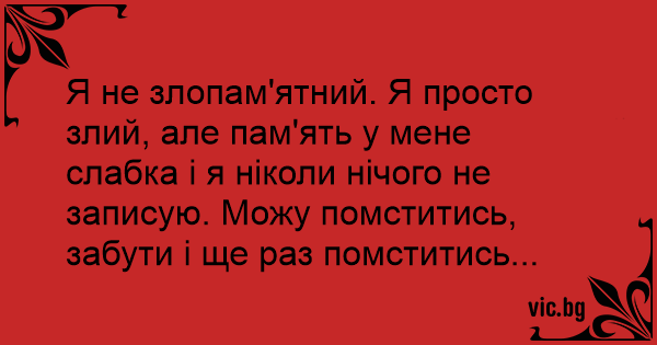 Я не злопам'ятний. Я просто злий, але пам'ять у мене слабка і я ніколи нічого не записую. Можу помститись, забути і ще раз помститись...