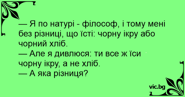 — Я по натурі - філософ, і тому мені без різниці, що їсті: чорну ікру або чорний хліб.
