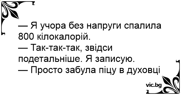 - Вчера без никакъв зор изгорих 800 калории. - Това е добре, казвай подробно. Записвам си. - Просто забравих пицата във фурната.