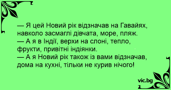 — А я Новий рік також із вами відзначав, дома на кухні, тільки не курив нічого!