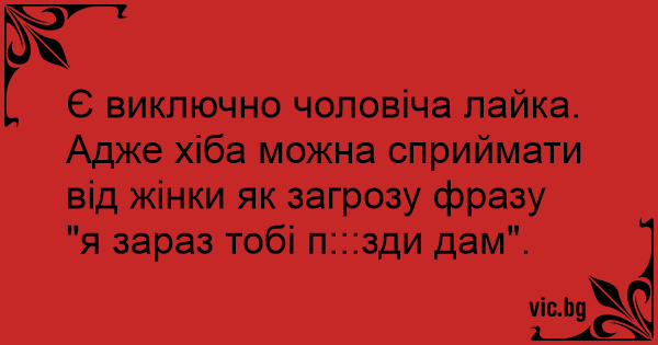 Є виключно чоловіча лайка. Адже хіба можна сприймати від жінки як загрозу фразу "я зараз тобі п:::зди дам".