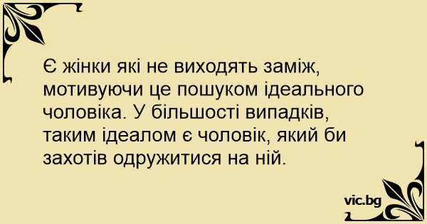Є жінки які не виходять заміж, мотивуючи це пошуком ідеального чоловіка. У більшості випадків, таким ідеалом є чоловік, який би захотів одружитися на ній.
