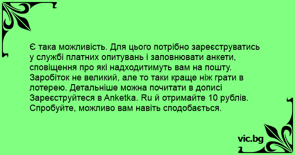 Є така можливість. Для цього потрібно зареєструватись у службі платних опитувань і заповнювати анкети, сповіщення про які надходитимуть вам на пошту. Заробіток не великий, але то таки краще ніж грати в лотерею. Детальніше можна почитати в дописі Зареєструйтеся в Anketka. Ru й отримайте 10 рублів. Спробуйте, можливо вам навіть сподобається.
