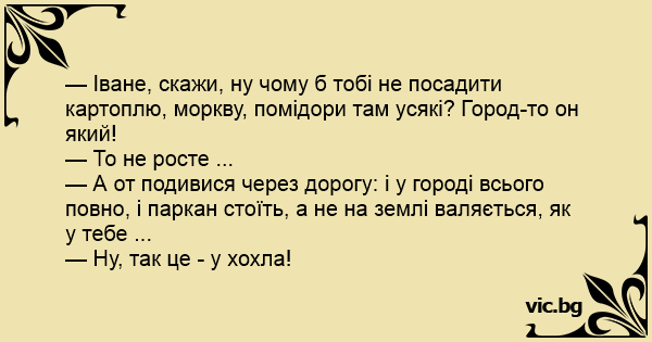 — Іване, скажи, ну чому б тобі не посадити картоплю, моркву, помідори там усякі? Город-то он який!